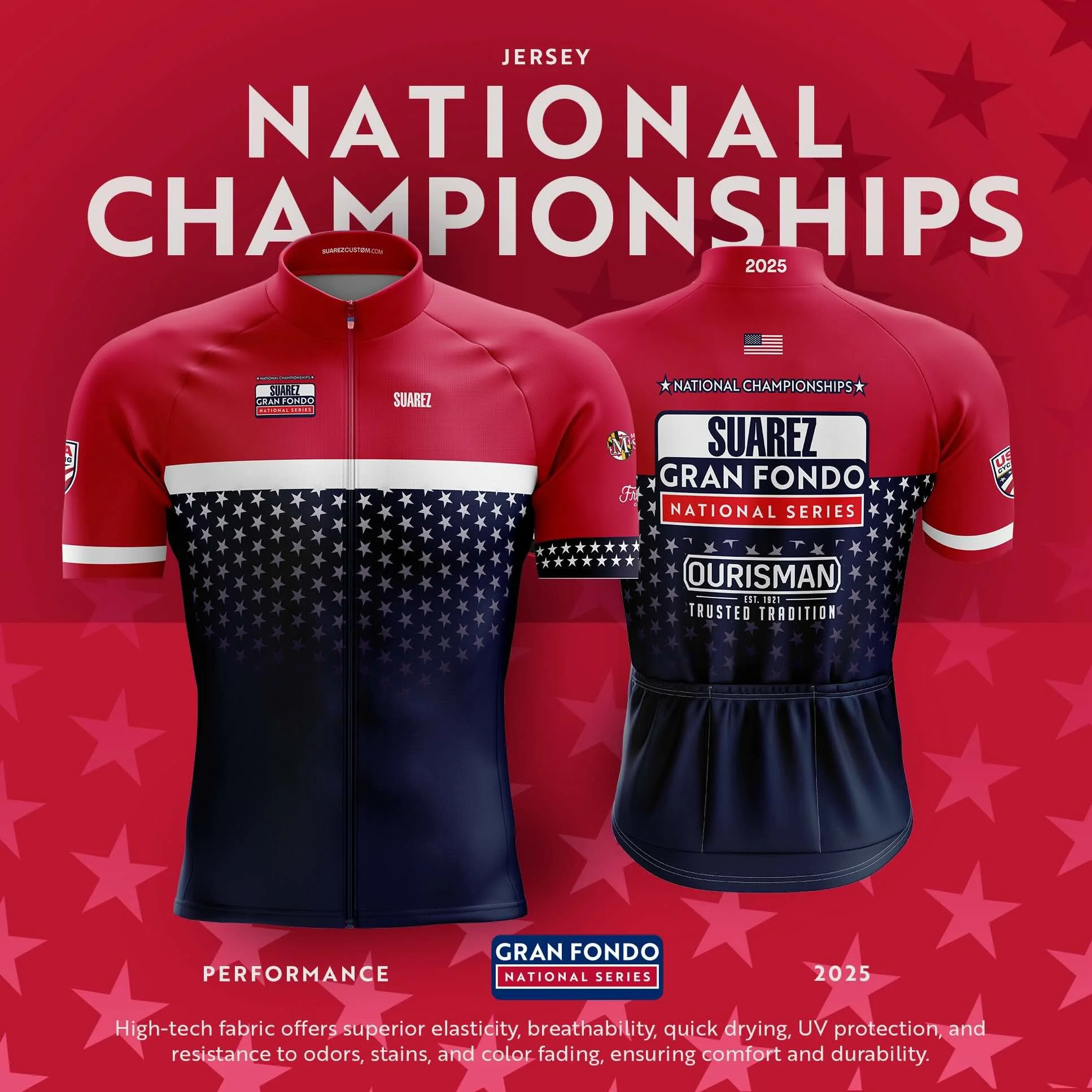 While only a select few will win official USA Cycling National Champion jerseys, all riders who participate in the 2026 National Championships event will receive a commemorative jersey from SUAREZ. The jersey pictured is the 2025 participant jersey, not the USA Cycling National Champion jersey. The 2026 commemorative jersey design has not been announced yet.