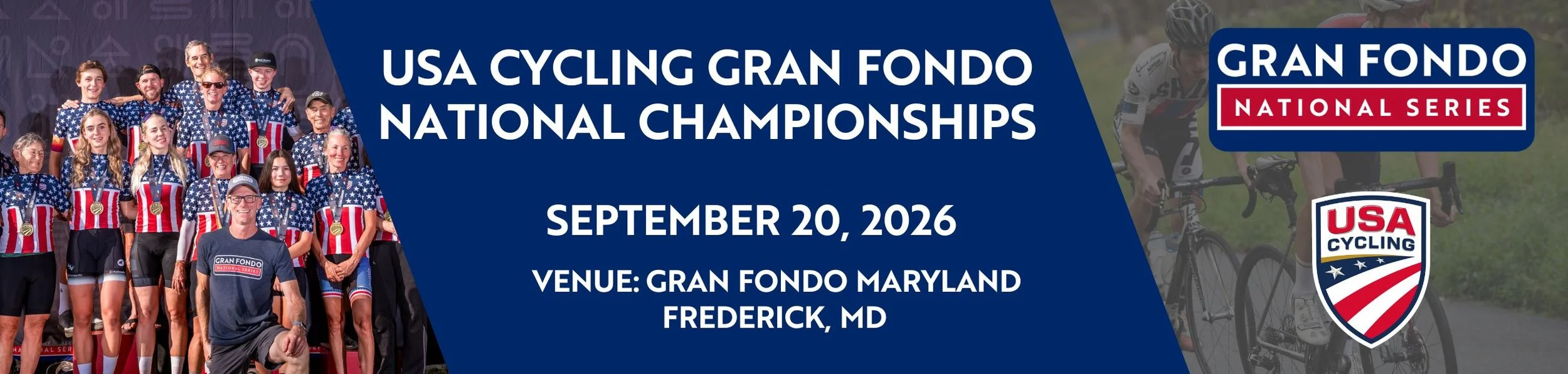 A USA Cycling Gran Fondo National Championships title, complete with a national championship jersey and medal, will be awarded to the overall winner in each Gran Route (~100 mile) National Championships’ age-group category at the annual USA Cycling Gran Fondo National Championships, which in 2025 will be held as a part of the Gran Fondo Maryland, presented by Ourisman Automotive Group, in Frederick, MD on September 20, 2026.
